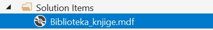 Први корак је додавање раније креиране базе података новом пројекту. У прозору Solution Explorer је потребно да се кликне десни тастер миша над називом пројекта, а затим да се изабере Add/Existing Item… са менија који се појави. База података коју смо креирали се већ налази на рачунару и потребно је пронаћи и изабрати фајл Biblioteka_knjige.mdf, у којем је сачувана. Тачна локација може да се провери у систему SQL Server Management Studio, у којем смо креирали базу.