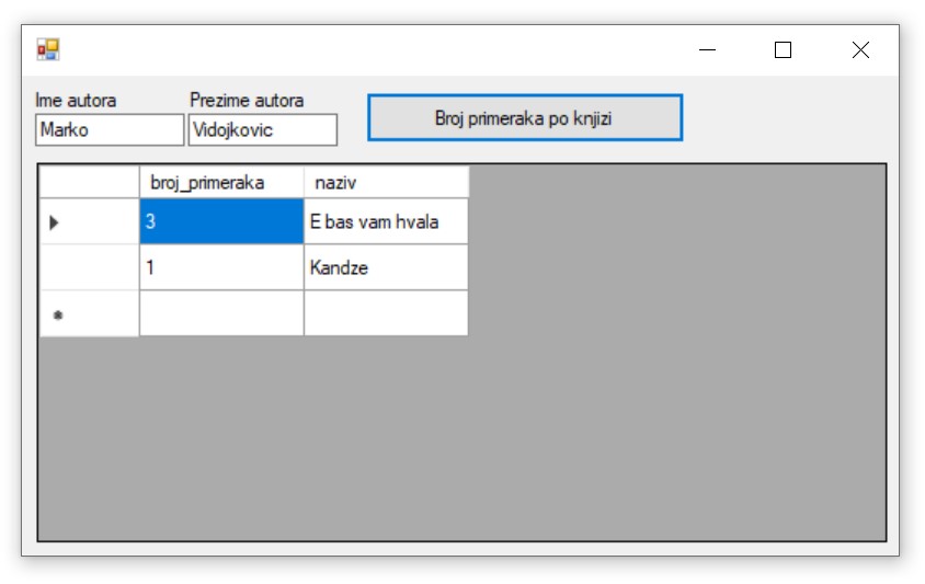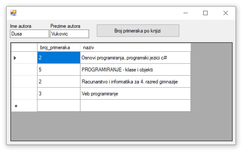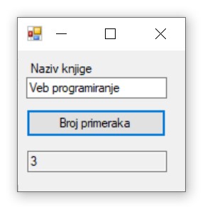 Што се дизајна апликације тиче, потребно нам је поље за унос назива књиге, дугме и једно поље за приказ броја књига. Следи комплетан програмски код. Уместо KONEKCIONI_STRING треба ставити конекциони стринг који је формиран у ранијим примерима, а односи се на повезивање програма на базу података Biblioteka_knjige.mdf.