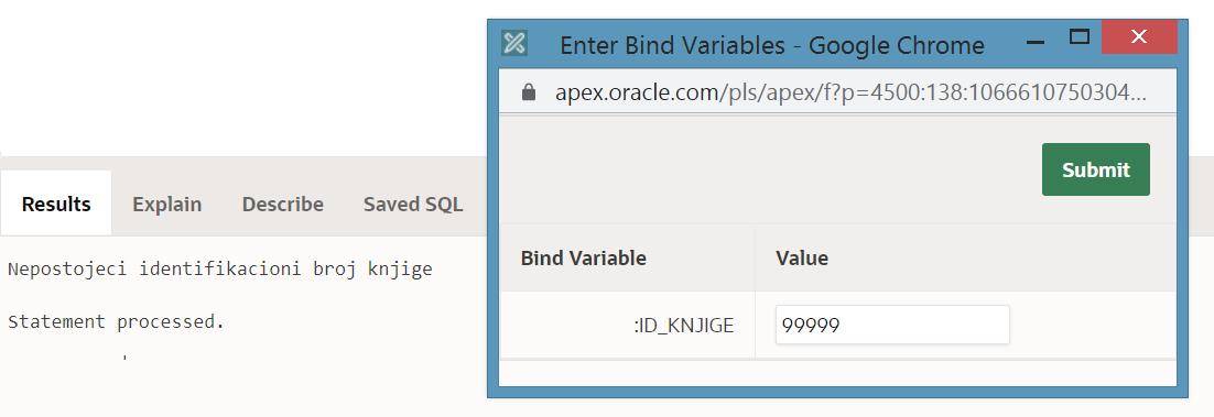 DBMS_OUTPUT.PUT_LINE('Nepostojeci identifikacioni broj knjige');