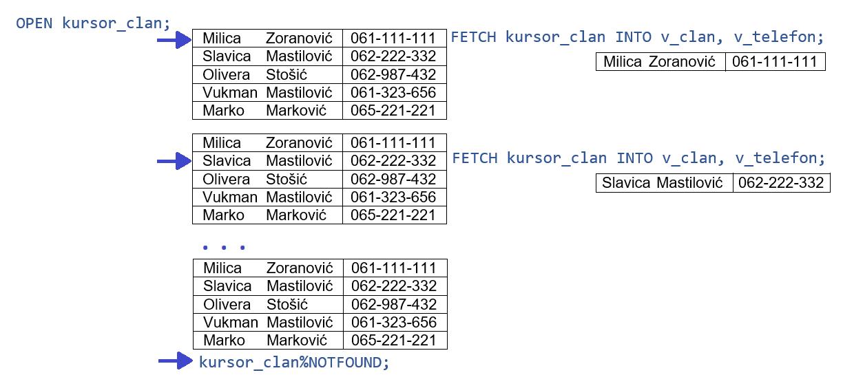 у циклусу се помоћу курсора чита један по један ред док се не прочитају сви редови резултата одговарајућег SELECT упита,