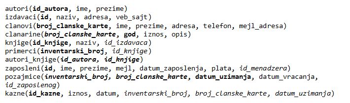 Креирати PL/SQL програме који узимају податке из базе података библиотеке. Следи списак свих табела са колонама. Примарни кључеви су истакнути болд, а страни италик.