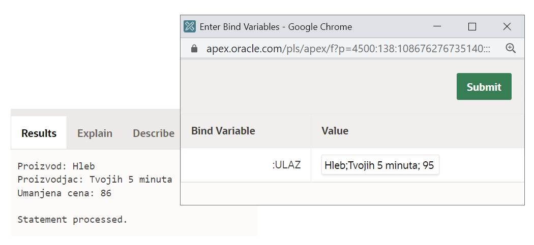 Креирати PL/SQL програм у који се уноси један текстуални податак који се састоји од три податка раздвојена тачка-зарезом (;): назив производа, назив произвођача и цена. Приказати у засебним редовима назив производа, назив произвођача и цену умањену за 10%.