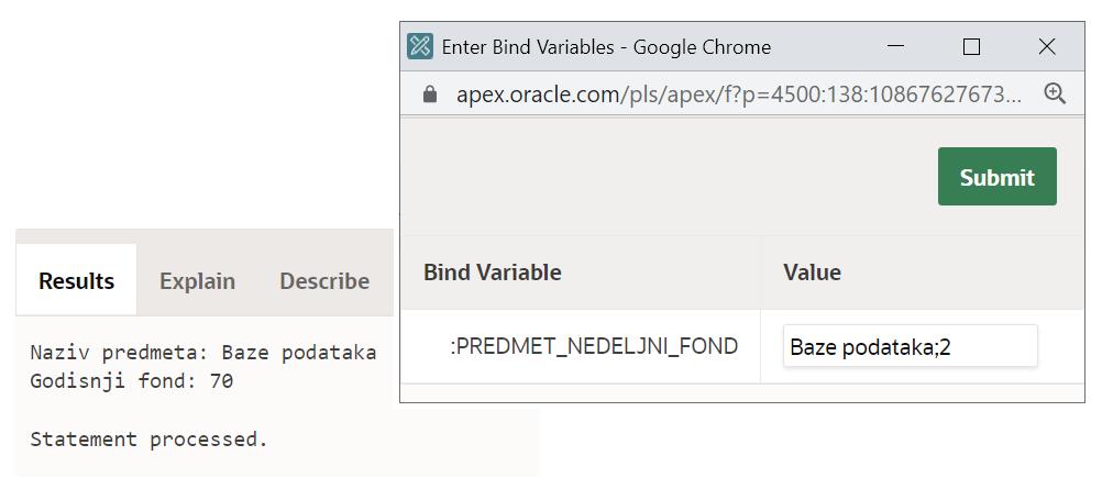 Креирати PL/SQL програм у који се уносе назив предмета и недељни фонд часова као један текстуални податак. Назив предмета и фонд часова су раздвојени тачка-зарезом. Приказати у једном реду назив предмета, а у следећем годишњи фонд (школска година за матуранте има 35 наставних недеља).