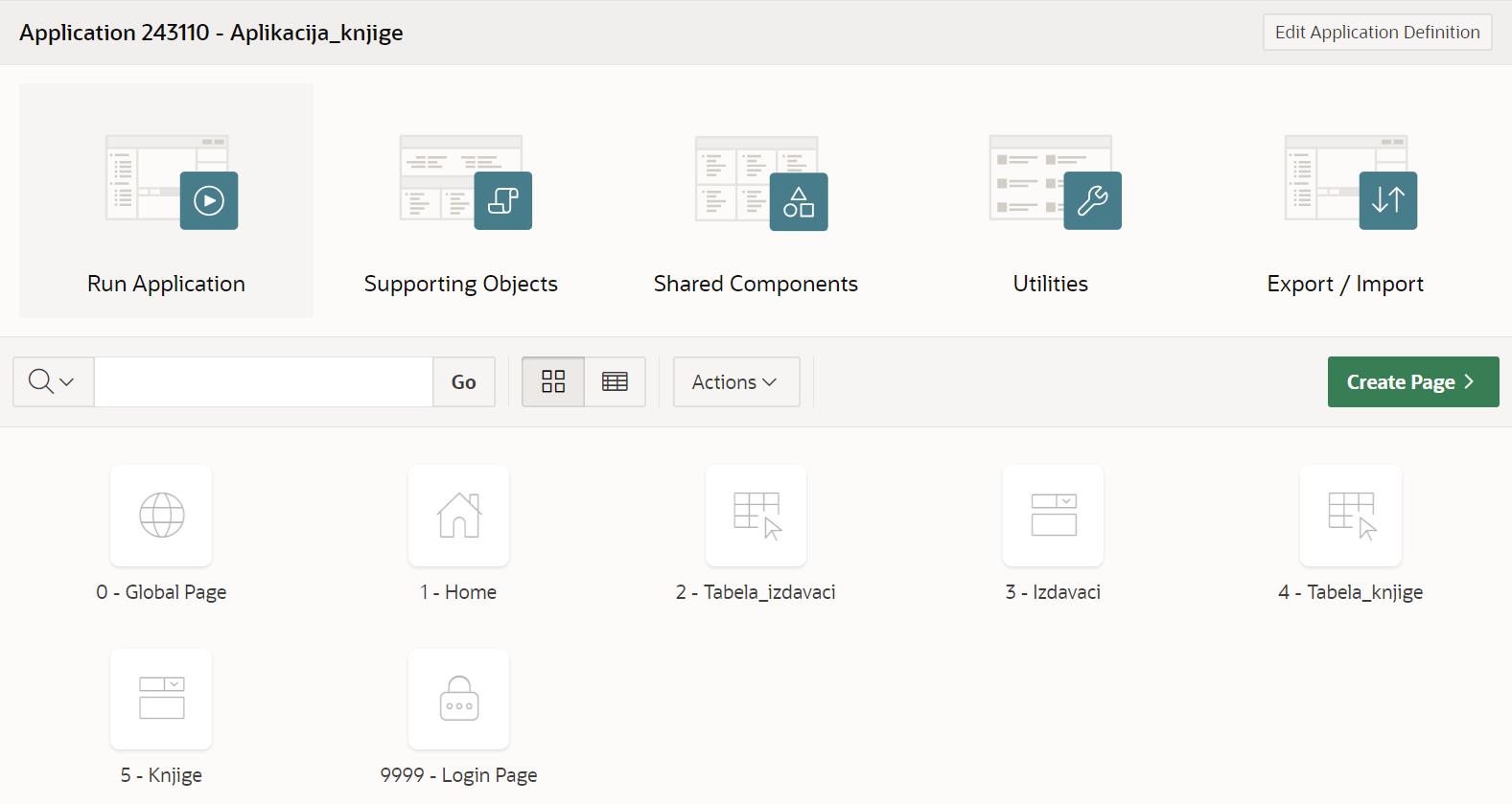 Након што се креира апликација, добијамо њен комплетан преглед са списком свих страница које су у нашем случају обрасци и извештаји у вези са две табеле. Као што може да се види на следећој слици, могуће је радити измене на апликацији кликом на дугме Edit Application Definition, а могуће је и додавати нове странице кликом на дугме Create Page.