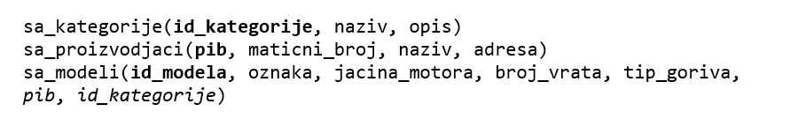 Креирати базу података за салон аутомобила на основу датог модела и података.